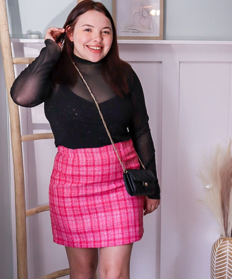 This skirt is all about fun and fashion! Tweed fabric brings the elegant vibe while the pink adds the perfect touch of playfulness! Perfect for a day out with friends or a night on the town. Embrace your style by pairing the tweed skirt with your favorite blouses & bodysuits!