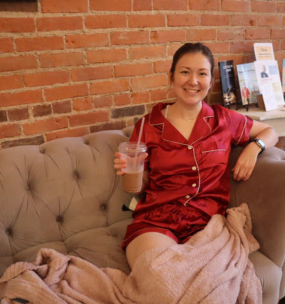 This Pajama set is a burgundy red color with white trimming, white buttons and a pocket on the front of the shirt. The great thing about satin pajamas is that they can be worn all year around!